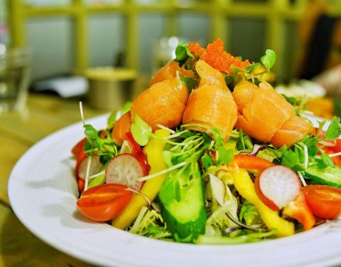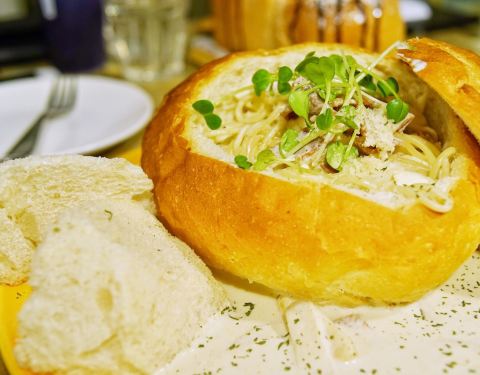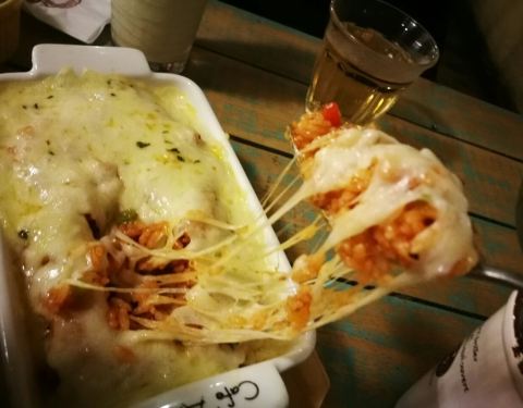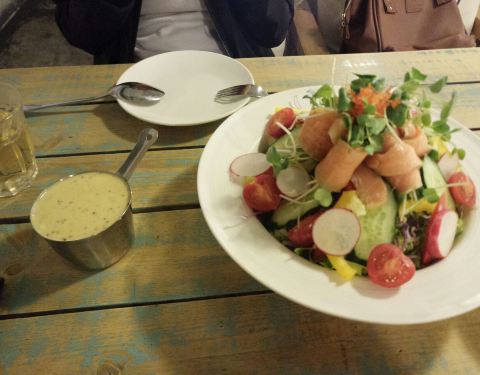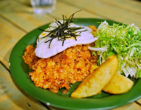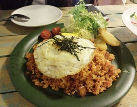环境非常韩剧小清新的咖啡厅,木质桌椅简约自然。三文鱼沙拉很大一份,奶油意面味道很浓郁,汤汁跟奶油蘑菇汤无差别。蜂蜜焦糖面包松软不失酥脆,培根泡菜炒饭用量足,微辣口味让人欲罢不能。