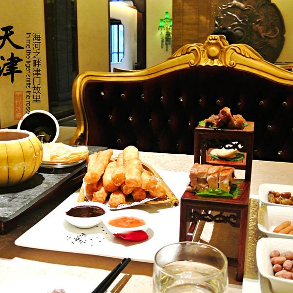 餐厅就在大悲院商业街上,距离大悲院很近,我是游览完大悲院直接过来的,餐厅装潢奢华,富丽堂皇的,分上下两层,需要注意下营业时间(11:00-14:00,17:00-20:30)我下午去的时候有点早了,正好遇到里面举办婚礼...餐厅就在大悲院商业街上,距离大悲院很近,我是游览完大悲院直接过来的,餐厅装潢奢华,富丽堂皇的,分上下两层,需要注意下营业时间(11:00-14:00,17:00-20:30)我下午去的时候有点早了,正好遇到里面举办婚礼,在外面等待了一会,进去被安排在了楼上。整个餐厅给人的感觉就是干净、精致,很多细节都做的很好,餐前还有水果和零食赠送,用以等餐时间食用,但上菜是很快的。我是专门为了招牌菜津味油条去吃的,油条里面有满满的虾仁,搭配两种不同的酱料,别有一番风味。特别喜欢搭配甜辣酱的味道,虾仁和甜辣酱综合一下,油条完全不会让人感觉到油腻。另外点了一道黄焖酥皮牛肉,软烂的牛肉搭配薄薄的酥饼,味道还好,不功不过。一道天津味道(武吃),就是三道天津特色的小菜,文吃是素,武吃是肉。还有一道忘记名字的鱼,鱼很软烂,味道不错。菜品的摆盘都很精致,用餐的愉悦度又有所增加。餐厅人均消费稍高一些,当时我有用代金券,相当于打了八折。PS:打包盒是需要收费的,特别喜欢他们家的打包纸袋,水墨风格的很漂亮,纸质厚实。
