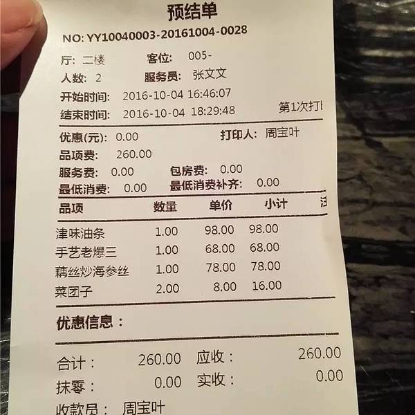 环境优雅,对我而言一楼有点冷清,二楼还不错,菜的分量挺大,点了天津的特色老爆三和津味油条,老爆三不太合我胃口,津味油条很不错,里面包裹着虾仁,文武两道前菜不多加说明,菜单上有介绍,鲜榨果汁会比较贵,一扎橙汁是138元,如果点果汁人均消费在200元左右。