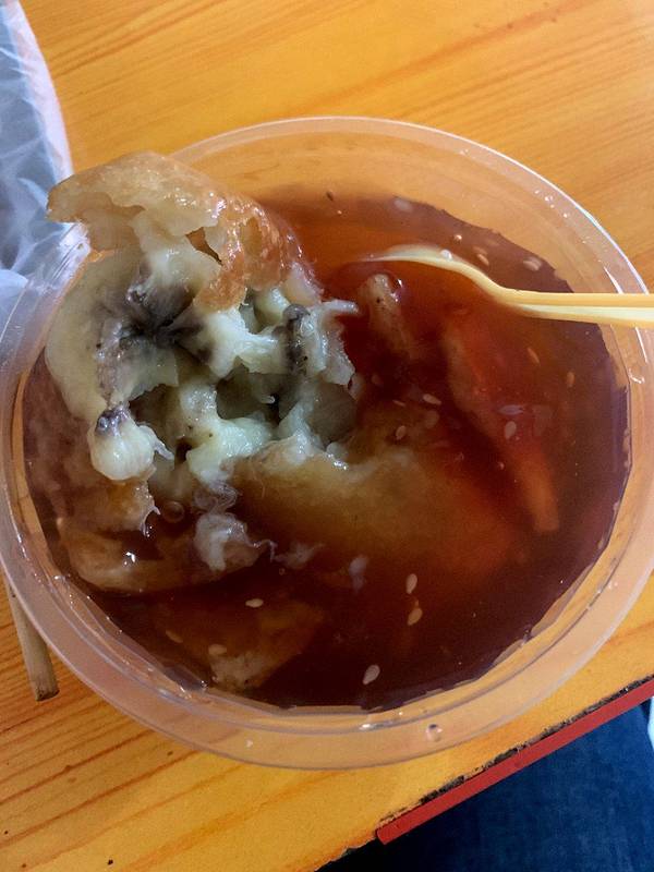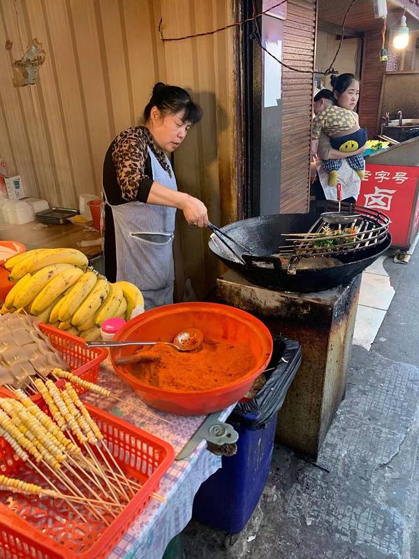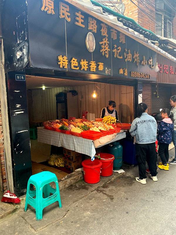 他家是我每次到安顺必吃的小吃之一,位于大名鼎鼎的顾府街侧面的将衙街上。 走到店门口就能看到各种各样的炸品,连玉米粒都可以穿成一串来炸,让人打开眼界。门头上的“特色炸香蕉”最值得一试,绝对是独一无二的。 炸香蕉是将香蕉剥开切成段,放入油锅中把表皮炸脆。用粘稠的类似于木薯粉的透明物质打底,将炸好的香蕉放入其中,起到降温和中和油腻的作用,这样的构思实在是让人啧啧称奇。 鸡尾和鸡皮也是推荐的炸品。二者都是卤制过的,而不是生的。鸡尾炸制之前,老板会用剪刀将其剪出几个口子,避免外焦内不熟的情况发生。炸制的时间控制得非常好,不糊不生,配上细细的只香不辣的辣椒面,趁着酥脆的劲儿吃下去,别提有多美了! 只是卫生条件不太好,老店似乎都是如此。