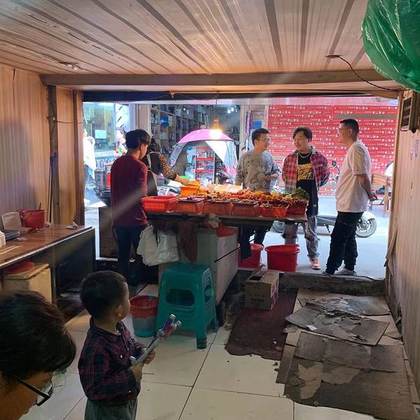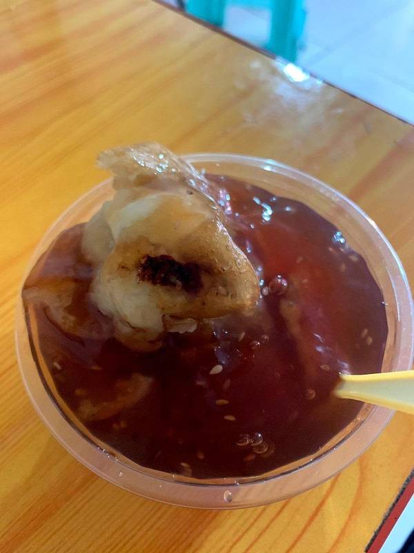 安顺真是美食的聚集地,听朋友说蒋记的炸香蕉是一绝,勾起了馋虫。他家店面在安顺传统的小吃街——顾府街的侧面小巷子里,还算好找。 门口的桌面上有不下10个品种的炸串,蔚为大观。首先点了招牌炸香蕉,香蕉很新鲜,掰下来后入锅油炸。 进屋静候,环境不佳:店里灯光昏暗,楼顶隔板感觉像木板搭的,好害怕会塌下来。 炸串配的辣椒面很细,和贵阳的不一样,入口香味十足,并不很辣,这样的辣椒面配油炸食品很靠谱! 最惊艳的是招牌炸香蕉,当老板抬了一个小碗上来,我还真没看出来是什么东西。正准备问,我没点冰粉啊,炸香蕉呢?拿勺子一搅,香蕉居然掰断了放在像藕粉一样的凝胶中。先舀一勺藕粉(暂且认为是),吃起来口感润滑细嫩,还不错。炸香蕉并没有因此而软掉,仍然倔强地保留了酥脆的外皮。这样的搭配真是别出心裁!让人惊叹!