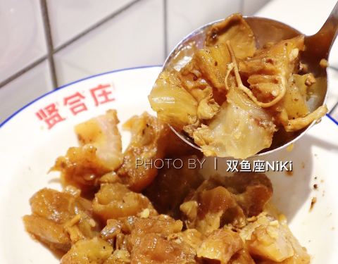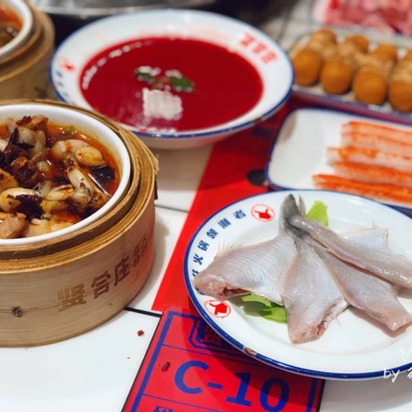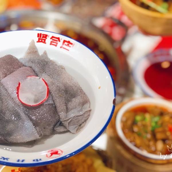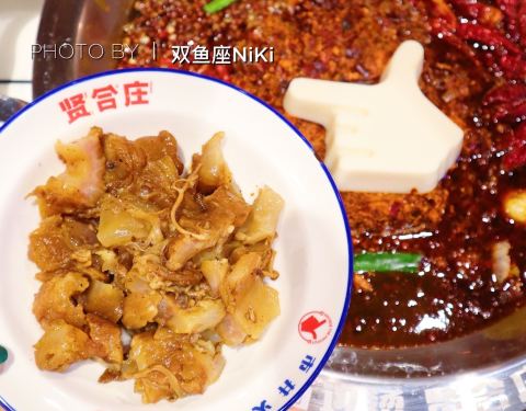 锅底选择红锅,必须红锅呀不然怎么可以目睹到可爱陈赫的八字手势呢,全红锅底辣味十足,还带了点卤味特别的香浓,不能怎么吃辣的宝宝们都可以点,不是很辣哦。 手剪香菇肥肠:新鲜出炉的卤味肥肠、卤香的味道实在太浓郁了肥肠干净新鲜分明可见,口感细致又细腻很有嚼劲,路到食材的精髓了,撒上一点点的小米椒配上一点味道。两个人一起分享绰绰有余量足。 一碗牛杂:热卤现捞现点现烫,保证你吃到的是刚出来的热乎乎的卤味,牛仔这个劲道非常十足呀,牛劲每一块都是很大块的,底部还有养生萝卜千万不要忘记吃啦,四个人可以分享的一个卤味。 猪肉滑:大家吃过了很多的虾滑这一次,这家创新菜品的猪肉滑,新鲜的猪肉做了猪肉滑,吃上去的口感很赞了,猪肉的口感都是非常不错的,两个人分享是恰到好处了。 嘎嘣脆骨:如名字一样是真的很香脆的,口感嚼劲脆骨非常的香浓可口,被辣椒包围的脆骨,配上锅底的卤味太赞了吧。两个人可以分享一盆,器皿也很有意思刻着贤合庄的logo。