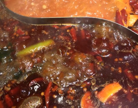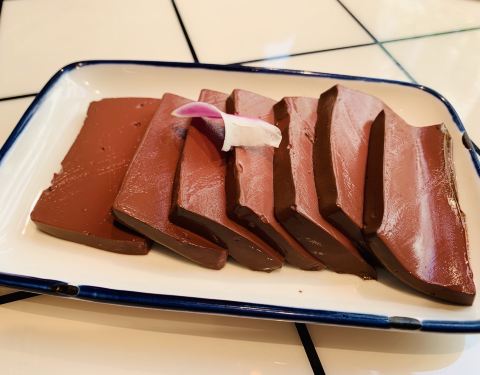 血旺 红彤彤的一碗血,是不是也寓意着来年一片长虹?血旺要多煮一会儿,直到浮起来才能吃,嫩滑细嫩的血旺吃了好几块。