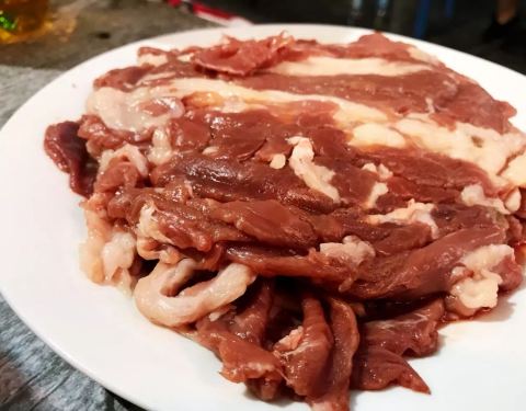 店面很小很旧,卫生一般,但是生意不错,回头客很多,老两口一个收钱一个烫肉,一个稍年轻的小伙子在片羊肉