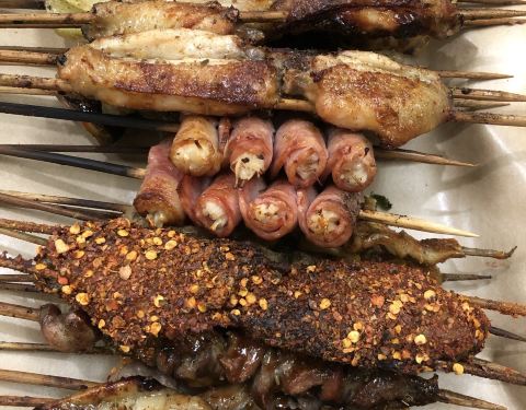朋友带着慕名而来的一家烤翅店。味道还是很满意的。地点在中原百货后身的一条小路上,有些不起眼不是太好找,店门挺小的,店内装潢也是不怎么样,基本就是一个路边烤翅的档次,桌椅也是非常轻薄的感觉,坐下来凳子直晃悠,卫生状况也不是太好,整体就餐环境一般般吧。要了羊肉串,骨肉相连和特色的各种烤翅。羊肉串很大的肉块,有些意外的小惊喜,羊肉口感非常好,烤的火候也是把握的不错,吃起来很香,骨肉相连比较普通,味道中规中矩吧,鸡翅是特色有好几种烤法,有正常的,有辣的,有刷酱的,刷酱的也分甜的和辣的,除了甜的我觉得都很好吃,而且烤的外皮有些焦的那种口感还特别好,推荐这里的烤翅,砂锅要了一个醋浇豆腐,用的是白醋,太酸了。服务方面,上串挺快的,所以还不错吧。