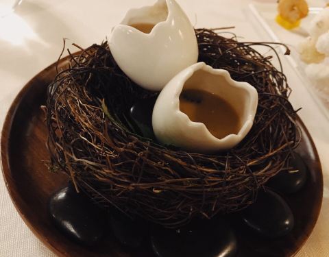终于有机会来这家品尝地道的,高大上的法餐,价格不便宜,但是吃过感觉物有所值,反正又不是天天吃,偶尔的浪漫一次。吃法餐,必点的当然是鹅肝,之前很多次在一般的料理或者自助品尝过鹅肝,而你吃了这家的才知道什么叫做入口即化的鹅肝,非常棒,主菜我们选择了蜗牛,菜名应该叫做勃根第焗蜗牛,看起来绿绿的,感觉很健康啊,浓绿色香料混着汤汁,饱满肥厚的蜗牛肉,实在回味,这是我第一次吃蜗牛。要了6成熟的牛排,切开还带点血,还是一个字嫩,食材是真的好。点了生蚝和三文鱼,生蚝特别新鲜,让我想起在深圳吃的鲜生蚝,三文鱼尝试了一把烟熏的做法,感觉一般。其他的诸如甜品,饮料都顾不上了,反正味道都很赞。然后说说服务,地道的法式服务,男服务生彬彬有礼,绝对是培训过得的,始终面带微笑,感觉特别有亲和力,再说说地点,在天津五大道,应该是旧楼改造的,别有一番风味,吃之前和之后可以在五大道惬意的逛逛,开车的话建议停到外部的停车场,然后走进来,这楼下是没有停车位的。总结就是非常非常高大上的五星法餐,浪漫+好吃。