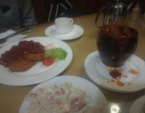 整体环境很欧范,来过很多次,红茶还是原来的那个味道,很不错,黑椒牛排很嫩,香煎龙利鱼很入味,猪肋排味道最好,奶油杂拌吃多了有些油腻,闷罐大虾味道很好,推荐大家试试。