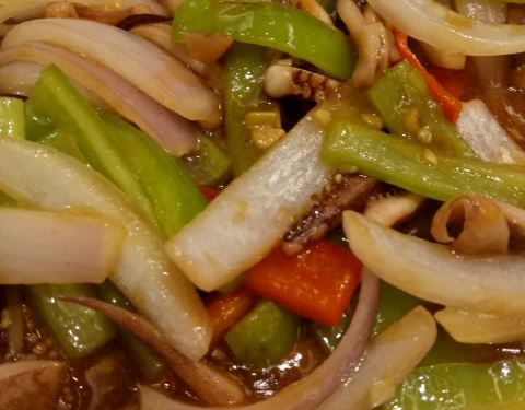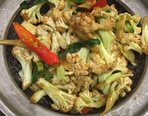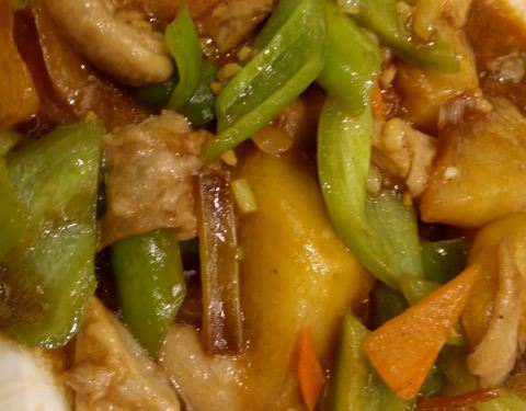 土豆,茄子,青椒炒制,裹了一层芡汁,色泽好看也更入味。苦瓜炒蛋。16元