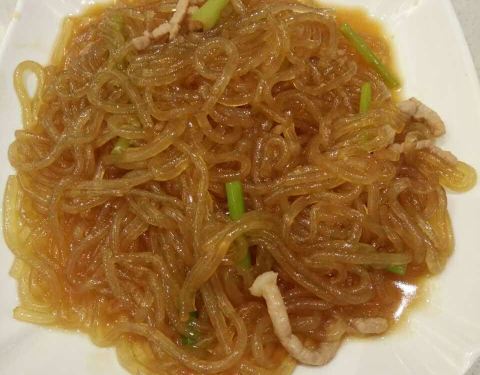 比较有名的东北菜啦,鸡块跟东北的蘑菇粉条炖一起,特别好吃,这个推荐点单。小伙伴惊讶的说道这不是蘑菇啊,有点像茶树菇,但其实这就是东北的蘑菇啊叫榛蘑,我特别喜欢榛蘑的味道,汤汁也很鲜,用的是粗粉丝很有嚼劲QQ的。东北拉皮。16元