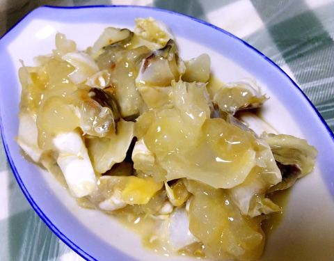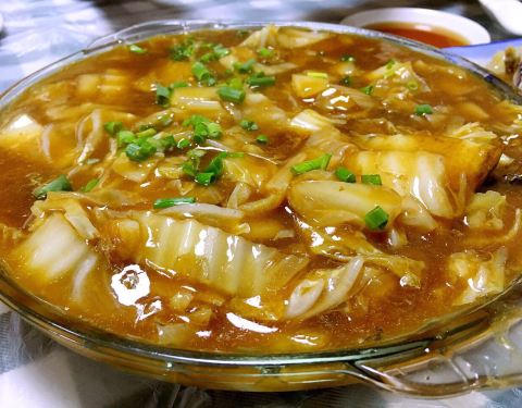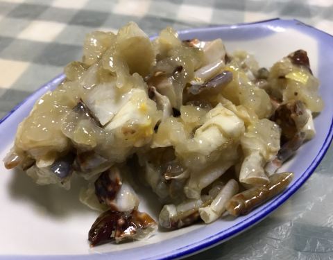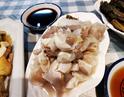 当地吃货朋友的私藏店,吃家常宁波菜的小馆,开了大约有20年左右,光顾基本都是熟客或老饕,朋友每周都光顾个三四次,一人食,还是带外地朋友第一餐,这家都是第一选择~朋友领我进饭馆,环境倒是没有想象中的“家常”,点菜什么自然交给朋友,点了他最爱的墨鱼大烤,红膏呛蟹,腐皮包黄鱼,油爆虾和肉糊辣。如问味道如何,是难得家常味,耐吃不厌,结果统统一扫而️!最爱墨鱼大烤,这里是宁波的做法,不见五花肉,而用卤汁和墨鱼一起加水焖煮,腌渍入味,当下酒菜极妙!ps最后一张是朋友发我的照片,最近饭店外搭了施工棚