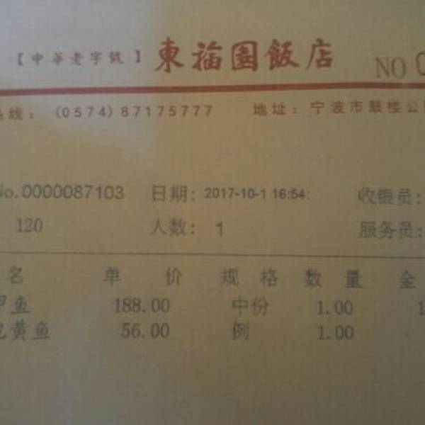 1、宁波著名的 东福园饭店(鼓楼店)位于海曙区鼓楼公园路7号,东福园饭店既是中华老字号饭店,又是浙江老字号。 2、东福园,是全国首批“中华老字号”,始建于1908年(清光绪三十四年),至今已有110年的历史。东...1、宁波著名的 东福园饭店(鼓楼店)位于海曙区鼓楼公园路7号,东福园饭店既是中华老字号饭店,又是浙江老字号。 2、东福园,是全国首批“中华老字号”,始建于1908年(清光绪三十四年),至今已有110年的历史。东福园以传统宁波菜为基础,结合绿色生态的理念,创新推出“咸齑(雪菜)大汤黄鱼、青鱼甩水、锅烧河鳗”等为代表的东福园十大名菜,成为业界和社会的共识,被评为“2016全国十佳老字号餐饮品牌”。 3、由于当晚只有一人食用,所以,只点了一菜一汤,菜还是冷菜,汤也是小份的。目的也就是尝尝东福园的味道。 4、点了四喜烤麸(冷菜),26元,什锦三鲜汤(小份),48元。烤麸相当味美,甜咸度搭配适中。三鲜汤,食材新鲜,味道鲜美,只是略微有点带咸了。 5、虽然,只有简单的两道菜,也没有点酒水、饮料和米饭,但是服务及其餐具,还是一应俱全的标配,这就是大店气派。 6、价廉味美,不错的店家,不错的服务——茶水免费送,这么大牌的店家且不收某某百分比的服务费,点赞。