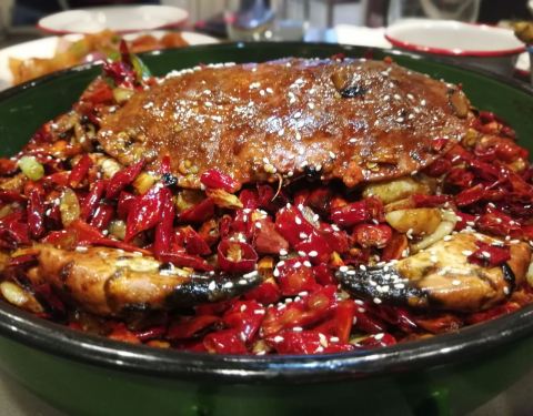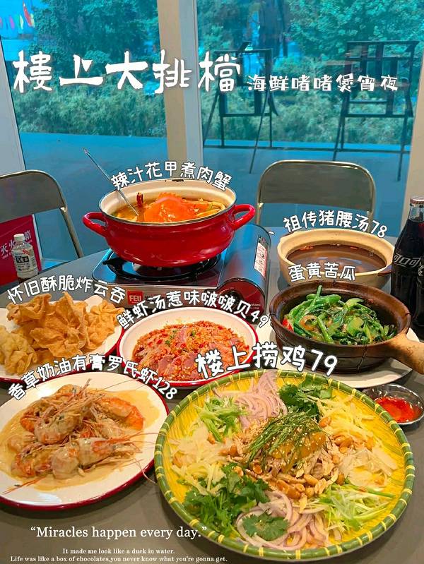 一家来自广州的大排档 没想到空降成都啦! 就在东大街,离春熙路超近的 正好跟朋友出去去尝尝 . 辣汁花甲煮肉蟹 超大一锅,花甲和螃蟹的标配 辣辣的很符合四川人口味 冬阴功的味道我超喜欢的! . 香草奶油有膏罗氏虾 一定要来尝尝他们家的这个罗氏虾 也是这里的招牌菜之一啦 . 楼上捞鸡 很有泰式风格的一道菜 份量也很多,在东南亚超流行 太适合夏天了 . 泰式大虾刺身 看起来就很新鲜的刺身 虾也是绝绝子!酸酸甜甜的 虾肉也很大很饱满! . 店名:楼上大排档·海鲜啫啫煲宵夜 地址:东大街下东大街段169号 . 值得一提的还有是zui近新晋潮人食堂,也登上过央视表扬广府菜,不吃真的很可惜… . 端午节可以带上朋友一起去尝尝 潮流文化的市井装修很好看 瞬间有一种到广州的感觉 一秒穿越到中环!