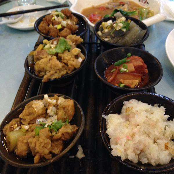 那天参观完殷墟博物苑和文字博物馆就找吃饭的地方。中午由于时间关系凑合吃了一顿,再加上这个晚餐是在安阳的最后一顿正餐,因此一定要品正宗的安阳菜。我们来到盛德利彰德路店。来之前就听说这是一家较正宗的安阳菜馆,于是,就点了扣碗(六个碗:酥肉、丸子、就腐乳肉、皮渣、排骨、甜饭)、炸血糕、安阳菜条、粉浆饭等几个有安阳特色菜。粉浆饭酸酸的,有点北京豆汁儿的味道(后来才知道,河南特色吃食大部分都有类似的味道),我能够接受。皮渣不是肉皮做的,而是淀粉做的(有点儿凉粉的意思,不过比凉粉硬),然后炒制而成。炸血糕就是炸猪血,蘸蒜汁儿吃,味道还行。 价格也还合理,5个人,花费了181元,人均36元。环境、卫生、服务都不错。