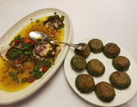 天目湖宾馆二楼,大堂里鱼腥味儿很重。 主打菜【砂锅鱼头】,鱼头炖好后大砂锅贴封条上桌。听说多年前这家的鱼头砂锅红遍上海滩,鱼汤呈乳白色,天目湖臭干蛮正宗的,吃口香,量不大。 溧阳白芹蛮嫩,还不错,总体来说,菜没什么特色,仅靠鱼头汤撑门面