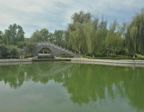 东湖公园,位于甘肃省平凉市区,绿树成荫,小桥流水,休闲的人们可以通过湖水中的石柱穿越到桥的对面...