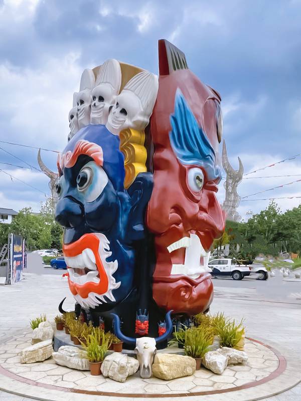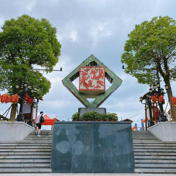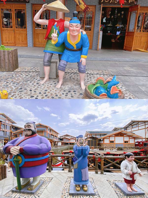 古越水街,就在龙虎山脚下,在龙虎山风景区游客中心外面,而且从龙虎山坐游览大巴出来的时候会停在水街的街口,让游人们都从这里出来,促进消费吧。水街建造得不错,有很多雕塑,还有一个镇妖塔。街上各种小吃餐厅都有,还有很不错的奶茶店。