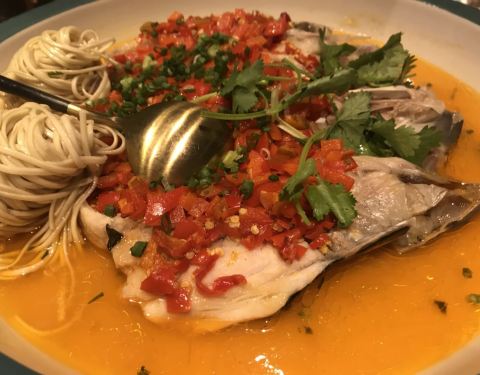 - 这家土菜馆装修环境很好,很舒适。汗蒸水库鱼,虽然上面铺满了剁椒,但是没有想象的辣,味道刚刚好