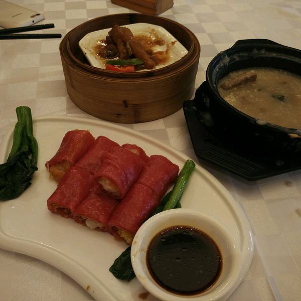 公司就在附近,去过挺多次的了,环境很好,早茶在规定时间内买单收台还可以打折,当然,也有很多的团购,价格还算优惠,昨天两个人吃了人均50元,挺实惠的。先说地理位置,就在华景新城的BRT站那里,下车就能看到路边有牌子,不用四处找。观光电梯直接上去3楼,两边都是喝功夫茶的,茶位5元,中间大厅普茶,茶位3元。因为附近很多写字楼,所以人很多,中午如果想来的尽量提早一点,不然就需要等位了。我们12点16分点的点心,因为他们说是立点立蒸的,所以可能等的时间需要稍微长一点,如果午休时间短的同志们就提早点餐或者提早过来罗,等了40分钟猪肝粥才上来,猪肝粥煲的稍微浓稠了一点,口感不太好,之后上了凤爪,味道刚刚好,大爱~~红米肠差评,等了那么久,上来的是冷的,差点就把它退回去了,里面的那一层都软了,都不知道做好多久,可能人多,就不计较了。榴莲春卷等到全部都吃完了都没有来,最后是催来的,说厨房把单弄丢了没有做出来,真影响心情,