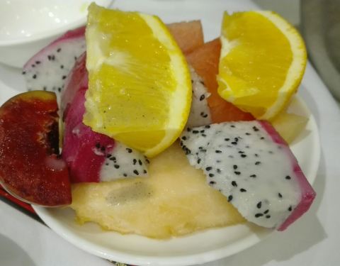 - 水果有火龙果、哈密瓜、山华李、西瓜、香蕉、木瓜、橙子等等,非常丰盛的“水果大餐”
