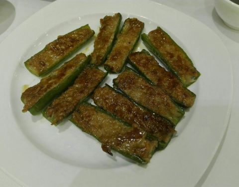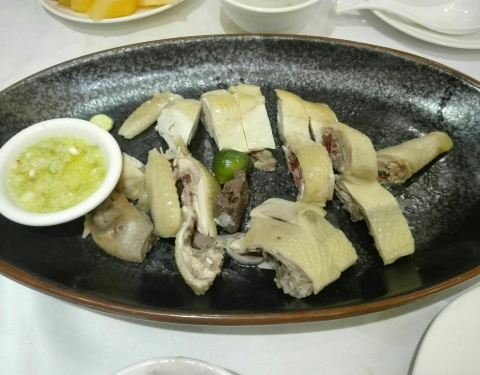 每星期一的富盈酒家有“自助水果”餐,每个月的第二个星期一又是他们的“会员日”,会员日可以使用积分抵消费金额,或者消费金额积双倍的积分。昨天恰逢这个好日子,六点半去到就基本上坐满了大厅,差不多七点,自助水果区就已经排满了人,等着七点一到就开始自选水果,还有三种“糖水”供选择:芋头西米露,黑芝麻糊,雪耳木瓜糖水。水果有火龙果、哈密瓜、山华李、西瓜、香蕉、木瓜、橙子等等,非常丰盛的“水果大餐”!所以我们也只点了两个菜,半只海南文昌鸡,一碟酿辣椒,就足够了,吃得很满意,尽兴而归~