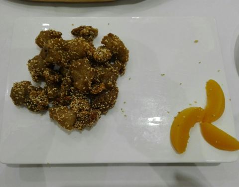 有一段时间没有来这里吃饭了,这次再来恰好碰上他们每月的会员日,每月的第二个星期一,可以使用积分抵扣消费金额,或者不抵扣现金就可以双倍积分,而且他们每周一的“自助水果餐”继续供应,非常不错!水果都是应季新鲜,杨桃、芒果、葡萄、橙子、火龙果、哈密瓜等等;还有糖水,芋头西米露、木瓜银耳羹、黑芝麻糊,全部不限取,当然好东西还是有限的,太多人拿,走两回就没了,比如芒果、葡萄,想吃好的早点去排队,晚上七点准时开放供应。 这次还点了一道“|片皮鸭二食^”,128元,服务员先把整只鸭片出脆皮,像北京烤鸭的吃法,用荷叶饼包裹烤鸭脆皮、虾片、大葱、黄瓜、蜜瓜、酱料等,卷好送入口中,真是别有一番风味,非常不错!另外的鸭身,我们选了用凉瓜焖,需要花些时间,等我们都吃完了才姗姗来迟,揭盖那会,香气扑鼻,焖得很入味!这就是他们的“|片皮鸭二食^”了,好值得推荐哦~ 其它几个菜也还可以,总体感觉还比较满意,记住周一来吧,一定会尽兴而归。
