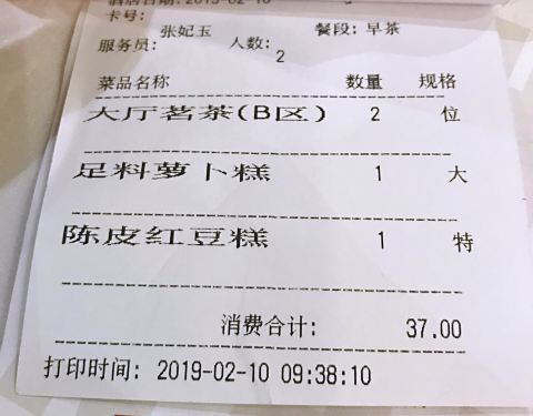 环境很好,早茶在规定时间内买单收台还可以打折,当然,也有很多的团购,价格还算优惠,昨天两个人吃...