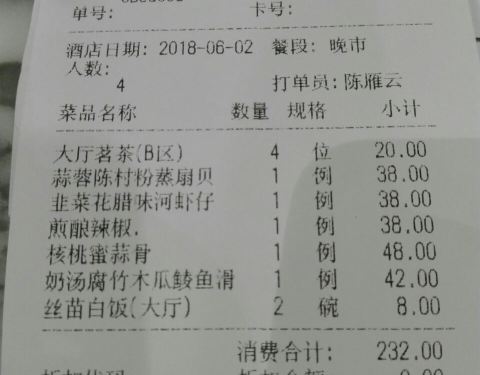 ...吃过,也还可以,总体觉得这几个菜蛮不错的,四个大人加一个小孩买单232元,性价比OK,值得推荐