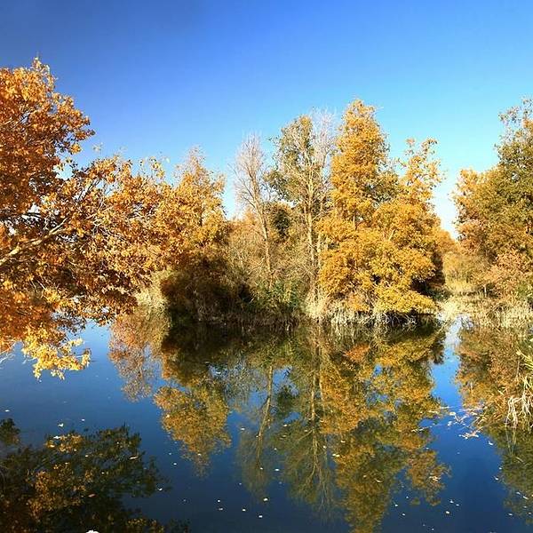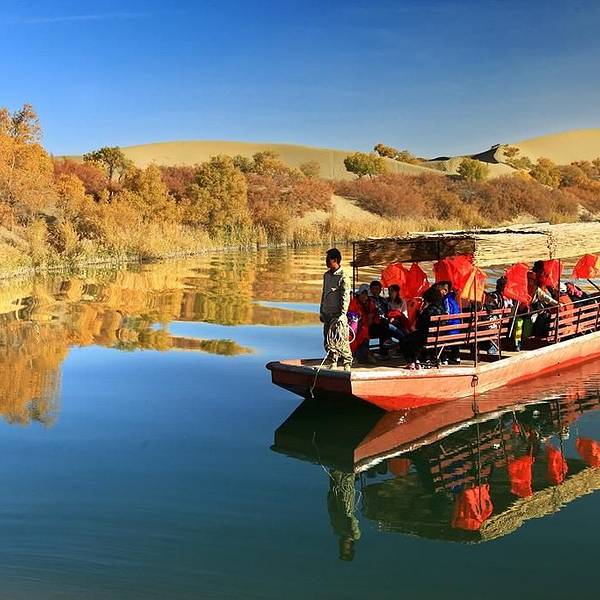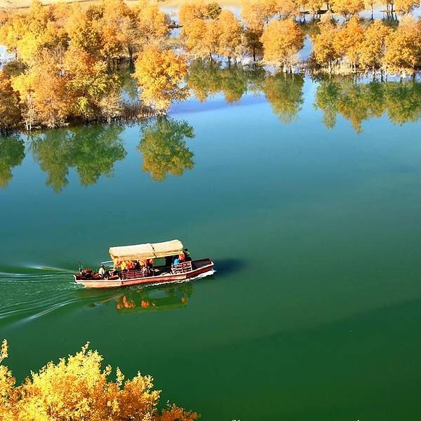 葫芦岛是一个葫芦形的湖泊,是塔里木河在下游的一处弯道,其特色是水中有岛,沙中成林。蓝天白云下,湖泊与胡杨静卧于大漠中,连绵的沙丘、茂密的胡杨树与碧绿的湖水浑然一体,满世界是绚丽的金黄。葫芦岛可谓是梦里色彩斑斓的画卷,美得不真实。 要到葫芦岛,需要渡船摆渡到对岸。 从33团出发,驱车穿过棉花田和盐碱地,半个小时左右来到摆渡口。渡口的景色已是美得惊人,芦苇滩散落水面,苇草随风摇曳,哗哗作响的胡杨树已率先向我们展现了耀眼的金黄。这小小渡口已是如此,对岸的小岛又会是怎样的世界?让人不由得产生无限遐想。 一条由缰绳拉动的摆渡船停靠岸边,已经有二十多辆越野车停在周边。摆渡船不大,两岸的距离也不长。岛主和助手看我们四人从车里出来,笑话我们说,人家大队人马七点不到就排队渡船过去了,我们这会儿才来。我看了下手表,十点了。 水流湍急,岛主轻车熟路地用双手拉着缰绳一点一点地借用水流将船摆渡到对岸,再坐上岛上的渡口车一会儿就到了,这个渡口车类似载货大卡车。在这里,收取摆渡船及渡口车200元,没有门票。 从车上跳下来,走不多久,就到了仙境啦。簇拥的胡杨,荡漾的芦苇丛,沙丘若隐若现,入眼帘的全是深浅不一的金黄,碧绿的湖水因为太过平静也成了“镜湖”,金灿灿的各种倒影使湖泊一跃成了金色之湖。 也就是说,一上葫芦岛,第一眼看到的就是仙境。 从这里可以步行游览到远处的沙区,再从远处的那个迷你渡口坐小型机动船回到这里。也可以直接从这里坐船到远处的沙丘,再走回来。你可以理解为岛中有湖,这个湖应该是内湖,静得无一丝涟漪。这个小型机动船是要另外收费的,不贵,绝对值,因为乘船过程中又是一道耀眼的美景,可以近距离欣赏河两岸各种造型金闪闪的胡杨。沙丘和胡杨倒影柔美醉人,宛如浓重水彩画。 我们在葫芦岛是先步行游览,再坐机动船去另一个沙丘,最后坐机动船回来,再爬上沙丘拍日落。 最惬意的玩法是登上沙丘之颠,俯瞰葫芦岛四周美景,看连绵沙丘与湖水和胡杨相辉映,看船儿拉皱平静的湖面,掠过簇拥的胡杨。一湖倒影一湖诗,半湖金色半湖蓝,宛如进入一场幻境。渡口,芦苇滩渡口过渡到葫芦岛的第一眼所见的画面过渡到葫芦岛的第一眼所见的画面过渡到葫芦岛的第一眼所见的画面岛中有湖岛中有湖乘坐机动船,船上所见的画面。乘坐机动船,船上所见的画面。乘坐机动船,船上所见的画面。乘坐机动船,船上所见的画面。登上沙丘登上沙丘登上沙丘所见的画面登上沙丘所见的画面