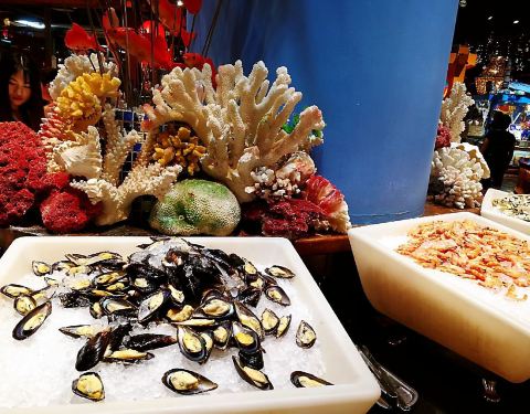 - 东西比较多,海鲜食材一般,甜品比较好。环境比较大,但有点挤,人很多。服务态度好