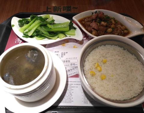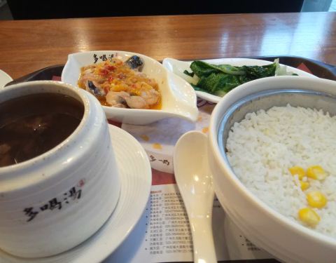 饭菜很香,汤特别好喝,但都是些快餐,份量也比较少,价格也稍贵了些,性价比不高。还有店里的环境也不错,服务也比较热情,都是由服务员来点餐,上饭菜还是挺快的。总体来说是个吃快餐的选择,就是价格要比真功夫之类的要贵不少。快餐店来说,算是比较有特色的吧,以汤为噱头。劣势就是餐食的品种比较少,吃多几次就厌了。环境还是蛮干净的,吃得比较放心