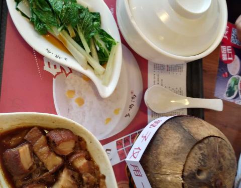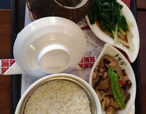 最爱椰子鸡汤,椰香浓郁,汤清甜。还买了梅菜扣肉饭,肥而不腻,给老妈点了香菇蒸鸡饭,鸡肉很滑,好吃