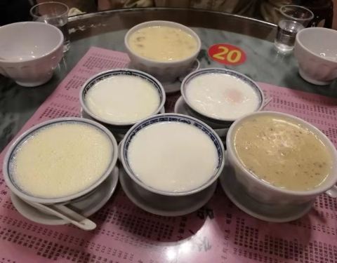 晚上系大石某条村的祠堂吃完婚宴,刚好说起附近的南村牛奶不错,于是就开车来吃。周末晚上接近10点,还是有很多食客。店铺只有一层,都几多位置,坐低会有服务员过来点餐。甜品有好多选择,牛奶类的最为出名,4个人,开始点了6个不同的甜品,大家可以每样试试味。香芋炒奶,红豆炒奶,凤凰炒奶,姜埋奶,窝蛋奶,双皮奶。其中个人觉得最爱味道最好的系香芋炒奶,奶香味和芋头的软粉的香味好夹。红豆炒奶相对味道偏甜左少少。姜埋奶姜的味道唔会好辣,适中。吃完6碗朋友觉得未够喉,又继续点左两个炖品和两款唔同的炒奶。桂圆炒奶和栗子炒奶,桂圆炒奶把桂圆同炒奶一起吃,味道很好。栗子相对来说没有香芋的质感好,但也是不错的。尼度的炖品都几好,花旗参炖老鸽,饮得出系真材实料。莲子炖雪耳,清润。4个人总共吃左80元,人均20元,抵吃! 另外尼度逢周三系休息的,记得唔好摸门钉~~