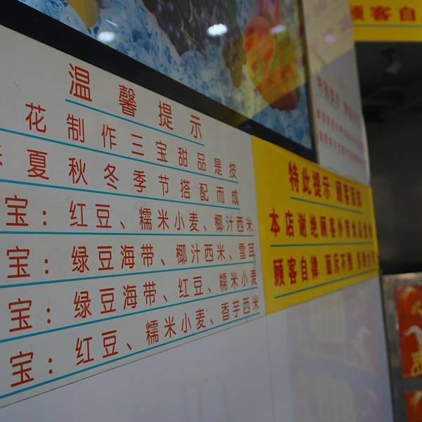 每次来都会看到不少孕妇带上保温瓶前来装上几款顺应季节的糖水带走,真会养生!百花的环境秀简约,但卫生条件还是相当不错的,还明文规定谢绝顾客外带食品堂食,保持了这里的一方净土。另外百花甜品还有著名的四宝:春三宝是红豆、糯米小麦、椰汁西米;夏三宝是绿豆海带、椰汁西米、雪耳;秋三宝是绿豆海带、红豆、糯米小麦;冬三宝是红豆、糯米小麦、香芋西米。大家可以顺应季节来选择自己喜欢的糖水口味和配搭哦~看到这个,会不会觉得有困难选择症?糖水的品种实在太多啦!