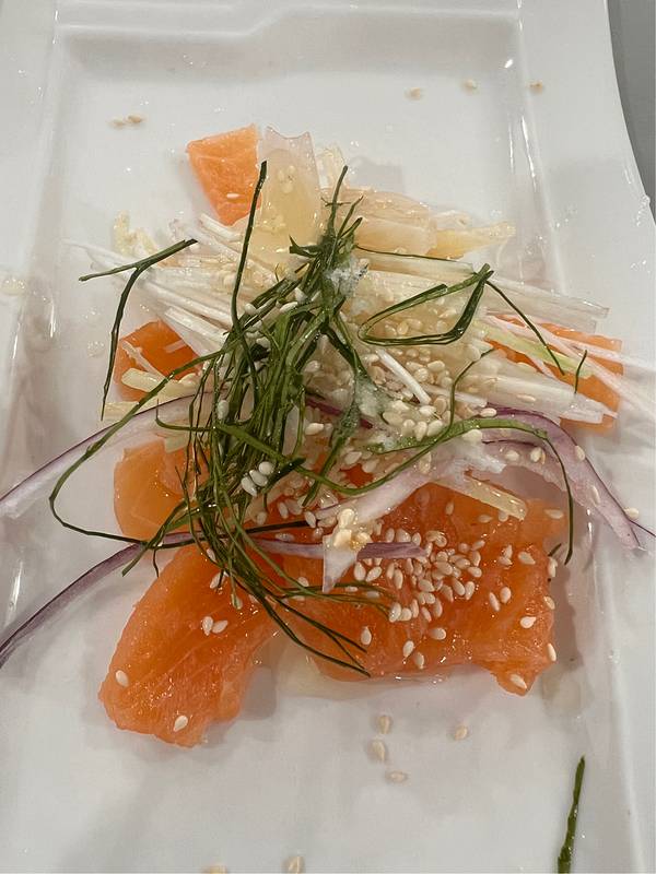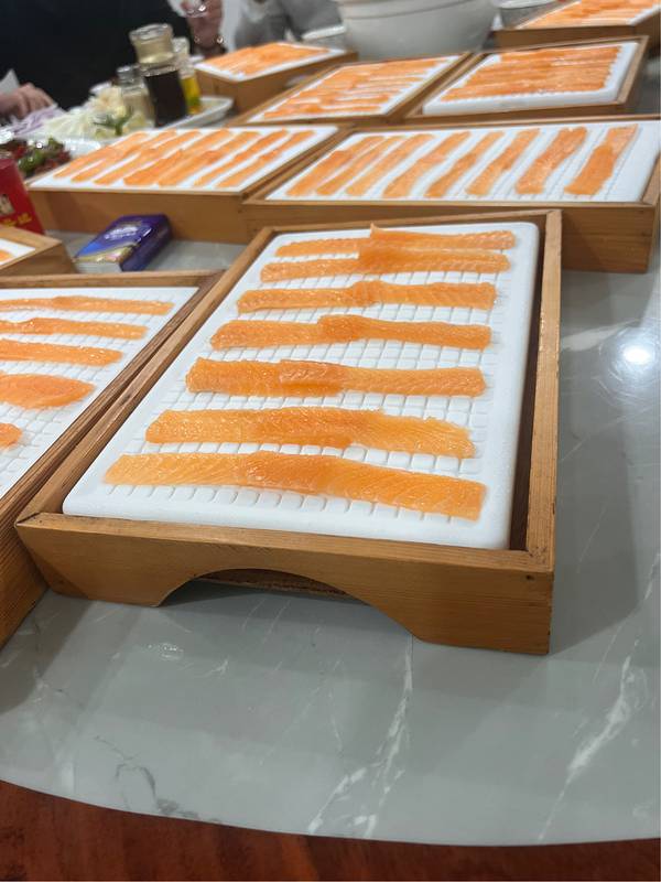 ...的,新鲜捞起切件,鱼肉有点像三文鱼,肉质都几嫩滑,但是因为是淡水鱼,吃起来没有三文鱼的鱼脂丰厚