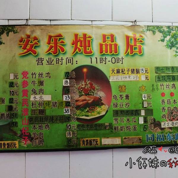 今天来给大家写点好吃的东西吧。安乐炖品店,同样是位于同福路,就开在芬芳的斜对面。不知道是不是因为人哥到的点数不对,店里头居然一个客人也没有。老板娘神态慵懒地闲坐在那里,也没有半点着急的意思。这地方横看竖看都不像是个觅食的地儿。人哥抬头,头顶的红字招牌分明写着安乐炖品四个大字,但颜色已经几乎褪尽。墙上斜挂着的一张大餐牌估计至少也得有个十年的历史了。也不知道是为了省事还是省钱,餐牌上面打满了大大小小的补丁,极度的不和谐。唯有那个破败的贴着白色瓷砖的灶台上垒着的几落不锈钢蒸笼稍微显得光鲜一点点。若是按照常理去推断,老板跟本就没有在用心经营这家店子。连装修都如此不讲究,又如何能够勾起客人的食欲?然而事实证明,经验往往是一件很不靠谱的东西。若被老板看到人哥以上的点评,估计会竖起中指,很不屑地来一句:“I don’t give a shit!”既然是来吃东西的,扯这些乱七八糟的东西干啥?