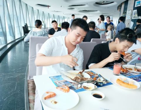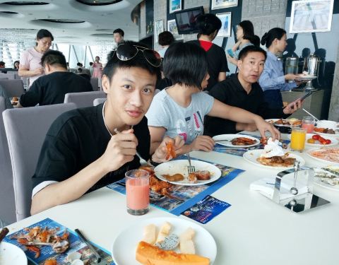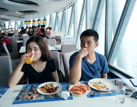 位于广州塔106层的旋转餐厅,风景优美,食物品种多样,每人一份波士顿龙虾〈其实是半只),不需下单服务员主动送到桌上,自助餐票包含了107层的观光。综合来说性价比还行。