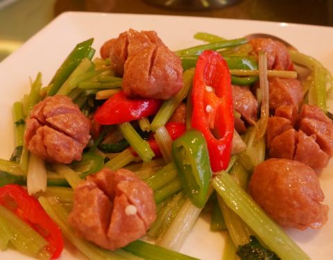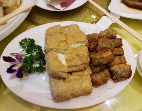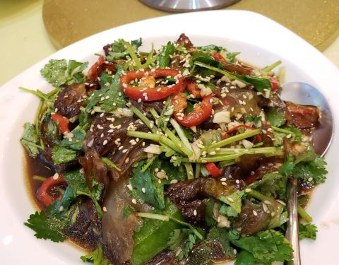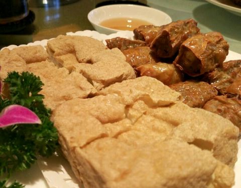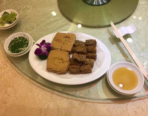 - 香炸百花胶,里面应该是虾胶,口感爽滑。 沙茶拌牛肉,牛肉嫩滑,沙茶酱味道也很好,最爱这个菜