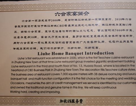 六合家宴就在珠江新城华夏路上,位置很好找,直接坐地铁五号线到珠江新城站,B2出口出来后转左再转左就能看见,附近也有公交车站,交通都很便利。餐厅也挺大的,3,,4层都是他们的,电梯可以直达。我们选择了3层...六合家宴就在珠江新城华夏路上,位置很好找,直接坐地铁五号线到珠江新城站,B2出口出来后转左再转左就能看见,附近也有公交车站,交通都很便利。餐厅也挺大的,3,,4层都是他们的,电梯可以直达。我们选择了3层的大厅,整体装修几漂亮,环境看上去很高档。 野菜猪杂鼎,汤水比较清淡,猪杂几新鲜,不过就不太喜欢这个野菜,如果能换成枸杞叶会更好。 潮汕卤水鹅,国庆的时候去汕头买了2次卤水鹅吃,爱上了它,这里的卤水鹅同样有在汕头吃的味道,鹅肉厚实,卤得够入味,而且鸭骨又细,满满都是肉。 香炸百花胶,里面应该是虾胶,口感爽滑。 豆干拼粿肉,潮汕真是多粿类,每次吃都有唔同的品种,之前在汕头都是吃素菜粿,第一次吃这粿肉,粿肉感觉与鱼腐差不多。 白菜双丸煲,牛丸很爽口弹牙,可惜牛肉丸不多,唔够吃啊。 沙茶拌牛肉,牛肉嫩滑,沙茶酱味道也很好,最爱这个菜。 煮杂鱼,鱼比较细条多骨。 芥兰炒粿条,炒很香,配上它独特的辣椒酱更好吃。 总体来说在这个地段,这个环境,性价比都不错的。