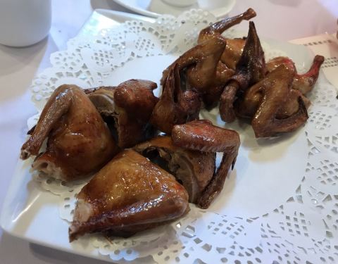 白灼海虾,虽然个头比较小但很新鲜味道不错。 茄子豆角炒猪颈肉,这个炒得很好吃,很香,三种食材搭配得天衣无缝。 清蒸红雕鱼,意想不到,很鲜嫩可口,卖相也好。 红烧乳鸽,虽然是赠品但烧得不错,火候刚好不会...
