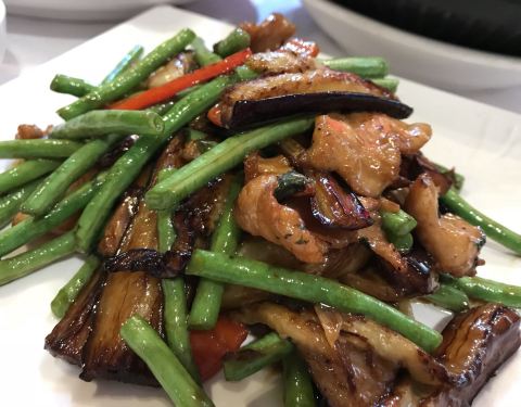 - 茄子豆角炒猪颈肉,这个炒得很好吃,很香,三种食材搭配得天衣无缝