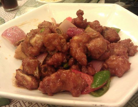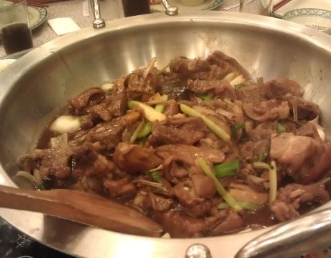 新兴出名的菜色就系吃羊,冬天最好就系打羊煲,暖胃。 点咗几个菜再加羊煲,羊煲就需要一边加热一边自己再煮,否则D羊系未够淋的。 首先上菜的都系白切鸡,餐宴必不可少的,造型都几靓。由于羊煲未吃得,所以呢碟白切鸡都几受欢迎。另外一个比较好吃的菜就系果仁羊扒,热吃的话唔会觉得好骚,炸过之后加上脆脆的果仁,别有风味。羊肚就比较韧,而且有少辣,味道就一般般,适合送酒。另外它的牛柳炒豆角味道都唔错,但大部分人就觉得偏咸,如果送白饭就正好。羊煲滚热后吃得七七八八仲可以自己加菜下去当打边炉...最后还加多了几个肉同菜,大家都吃得饱饱的,好多都吃唔晒。总体的感觉都唔错。