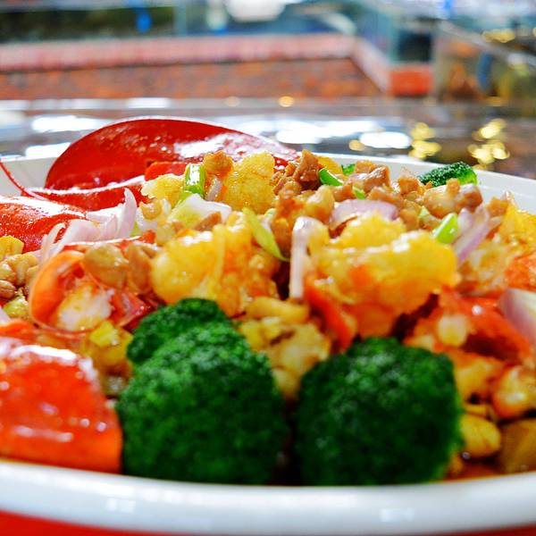 一帮小伙伴聚餐于此,发现这里门前修路,有点杂乱,不过店内环境还不错,二楼有包间,一楼自选点菜,主打各种海鲜,池子里养着大龙虾、皇帝蟹、老虎斑,美国贝,还有扇贝、带子、生蚝、罗氏虾,等等,丰俭由人,此外,还有各式炒菜,自由选择搭配,现成的烧鸭、牛叉、多味鹅等等,供人选择,总体感觉菜样很全,能满足来自天南地北的食客口味,而且制作出品也不错,至少体现了传统粤菜的水平,就是价格不够实惠,如果能推出团购、套餐之类的优惠,那就更好了~