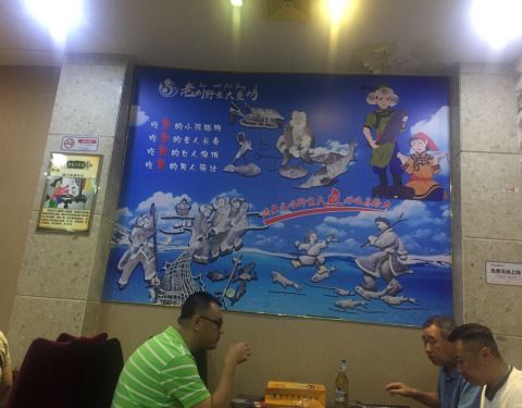 老刘野生大鱼坊铁锅炖鱼。 从潭村地铁站的d出口走出来,其实还是挺近的,十分钟就可以走到这家店了。 这家店里面大多是大桌子,因为有独特的锅和灶,所以说。桌子都很大,然后也有包间。可以适合商务宴请和聚会。 金店是晚餐时间差不多七点。然后等上菜等了很久。然后等鱼好又等了20分钟,所以说七点钟到差不多八点钟才吃上,饿死了。 之前也有送炒的瓜子。感觉服务不是很快,什么都要催。但是态度还是不错的。 与上来的时候感觉还是很棒的,先放一个隔帘,再放鱼鱼,然后放一盆汤料进去,然后再加上豆腐和生菜。 鱼肉我个人还是很喜欢吃的感觉很肥美。 就是吃到最后会有一点点咸。但是也可以接受。白菜和豆腐配着鱼汤煮一下也是很好吃的。最后还送了两个杂粮饼,我就不是很喜欢吃,觉得没有味道。 总体两个人吃也是管饱的。