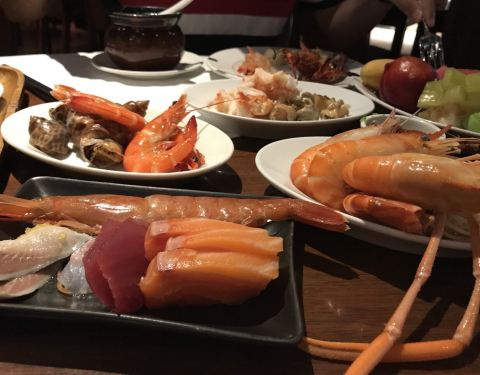 【刺身】三文鱼厚切又够肥美,红黄希鲮鱼,全部无限量供应,师傅一直切刺身,吃刺身的人很多,不过能满足供应。三文魚吃了2大碟,好吃,很滿足。【日式烧烤】日式料理,除了寿司和刺身,不能少的就是日式烧烤。味道很好。【海鮮】有大蝦,海螺,蠔,都是冷盤。【鲍鱼捞饭】是大连小鲍鱼,不过酱汁味道好,饭很好吃【扒类】丰富,有鱼扒、猪扒、牛扒、羊扒。师傅在现场现烤。【小罐子炖汤】很可爱的小罐子,当天是无花果炖瘦肉,好喝,可惜喝出了味精味。【甜品】好好吃的甜品,那样都好吃,吃了主餐,记得要留下位置给甜品。拿破仑——里面夹着的是酸奶酪,甜而不腻。芝士块——入口即化。炖蛋——很滑,焦糖足够。