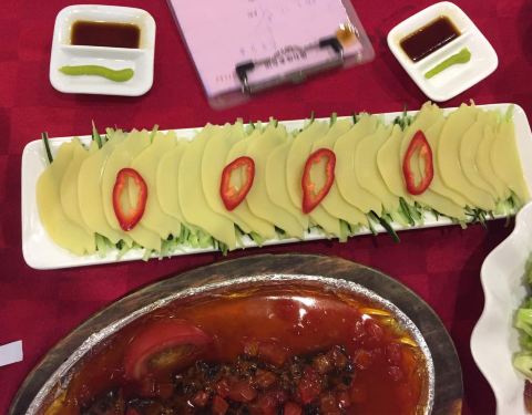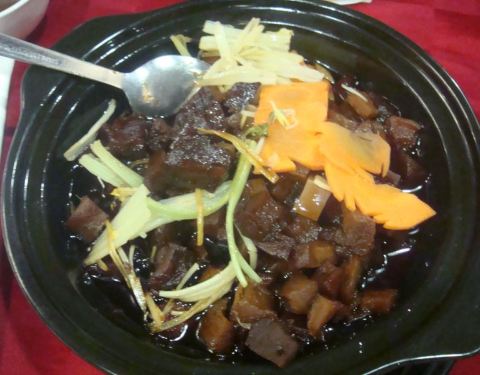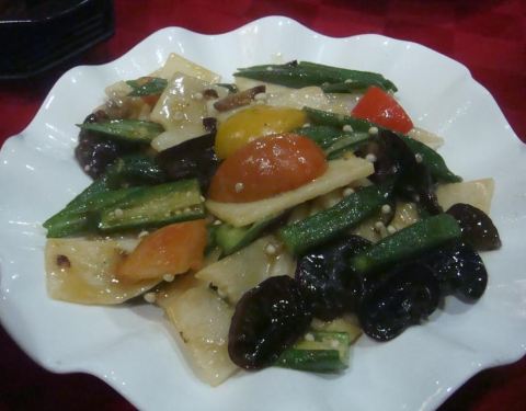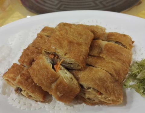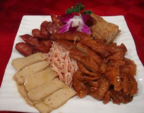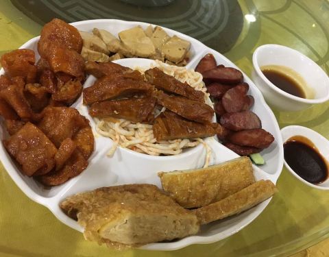 佛有缘,有佛便有缘。位于陈家祠附近荔湾路幸福新村内的素菜馆,店铺并不显眼,在荔湾体育馆正门的斜对面小巷入内,在巷口能看到比较醒目的招牌。每逢初一十五这里都非常多人来吃斋。经营这间店铺的是一对来自香港很慈祥的夫妇,他们的理念很好,主要是为了弘扬素食。 店铺的装修比较普通朴素,干净整洁。在墙壁上都贴满了合照和招牌菜色。这里还不是会有聚会,一齐组织去寺庙祈福,都只是收取必要的费用。 晚上的客人很多,我们提前电话预约了位置,服务员很快就安排我们上座了。点菜的时候刚好见倒老板娘黄太,菜牌里太多菜色,大家都不知道点什么菜好,她很热心地为我们介绍菜色,后来还专门过来和我们聊天,很亲切,很慈祥。 点了8个菜,原来还打算点个炖汤的,但太好卖了,全部已经沽清,唯有下次来的时候提前预约好炖汤。 素烧猪拼盘,每样都各来一点,可以尝试到不同的口味,比较喜欢素海蜇,还有素腊肠,模仿的味道相当像。 大爱无疆,有咖喱薯仔、杂菜、素虾、炸馒头等等。馒头炸得很酥脆,蘸上咖喱吃很好。 素叉烧,光看样子就很香,可以以假乱真,连叉烧的肥瘦都模仿的很像。吃上一口,连味道也模仿得很好,但这确确实实是素菜来的。 水煮罗汉斋,新做法,就像水煮鱼一样,有一点点的微辣,里面全部都是素菜,有芽菜、冬菇、云耳、菜花等等,创新菜色,很特别,各种菜色营养均衡。 上素玉米羹,没有炖汤就喝个玉米羹吧。这玉米羹很浓稠足料,虽然都是素菜煮的,但很清甜。 上汤竹笙青菜,竹笙很爽口,吸收了汤的味道,很不错。 素炒秋葵,老板娘推荐的一个菜色,可惜这秋葵感觉老了少少,比较干水,口感稍微差了一点。 素猪脚姜,很浓郁的猪脚姜味道,但没有猪脚,只有一粒粒的类似猪皮的东西,还有姜,驱寒暖胃,这个菜不是随时能吃到的,只有冬天才有。 最后送的红豆栗子糖水,很清甜。满足而有营养的一餐,偶尔吃吃素菜也是不错的选择。