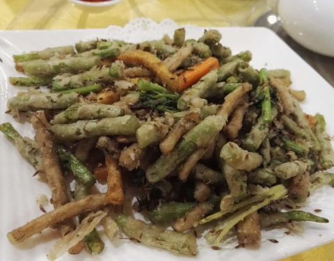 每逢初一十五这里都非常多人来吃斋。在墙壁上都贴满了合照和招牌菜色。馒头炸得很酥脆,蘸上咖喱吃很好