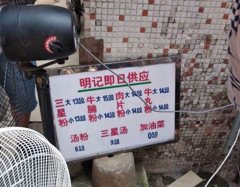 明记就是大名鼎鼎的“屎坑粉”,小小的一家店开在榕树下,居然已经有20多年的历史了。老板大概8点左右开档,一般到中午卖完了就关门,想吃的话得提早去,否则只有“明日请早”的份了。牛腩粉、三星粉是这里的招牌,端上桌后,咋一看上去很不起眼,当你喝下第一口汤时,就会开始对它赞不绝口。牛腩、牛三星新鲜入味,米粉爽口滑溜,百吃不厌。