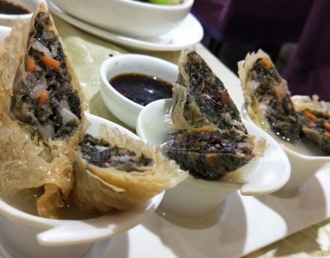 我们点了虾饺,锅贴,咸角,炸鲜奶等,每份量很大,吃不完。109块钱。