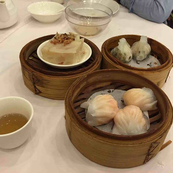 来了好几次广州一直说要去这家店这次终于去了。整个餐厅总共有四层,装修比较大气,整个餐厅有很多老人家在这里吃,人气很旺。二楼比一楼的选择多。大厅茶位费起7元一人,可选普洱、铁观音等,早上九点之前结账茶位费半价。点了茶以后服务员会给你一个单子,拿着这个单子自己去端自己看上的东西,每个端东西的地方有人帮你盖章,吃完后凭着单子上的章喊服务员结账。整个餐厅的小吃分为小食大食精食等,从十几元到二三十元不等。我去吃的时候点了一个虾饺一个萝卜糕还有一个混合了香菜肉的饺子,结账七十块左右。饺子是皮薄馅多,味道很好但是早上吃觉得有点油腻,因为很多肉。吃到最后理解了为什么要一边喝茶一边吃早餐。