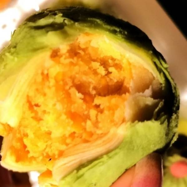 比起流心蛋黄酥,这个少了酥皮和流心但是奶黄馅儿很扎实,口感也不干 里面是甜椰蓉馅儿的,口感很丰富偏甜